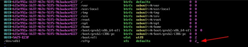 Druga cyfra odpowiada za kolejność ustawienia programu fsck (naprawa systemu plików), ponieważ 0 to cyfra, która używana jest dla urządzeń / (root)