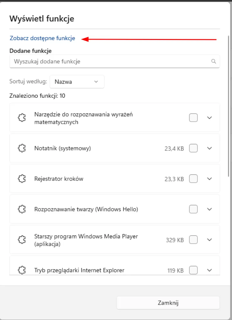 Instalacja odbywa się poprzez dodanie funkcji opcjonalnej. Należy wyszukać w polu wyszukiwania „Funkcje opcjonalne”