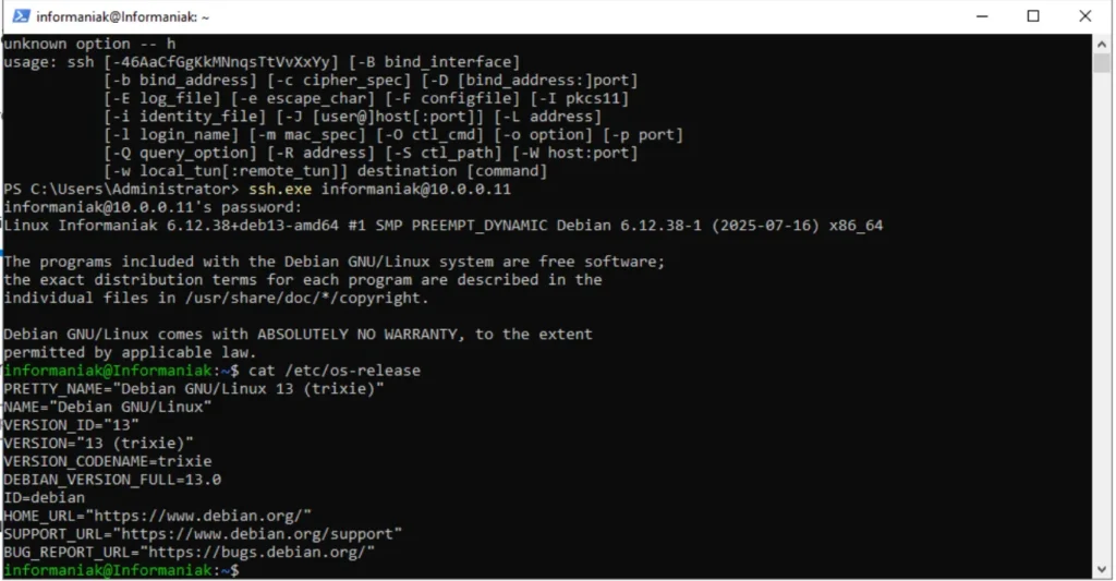 ssh.exeJeśli polecenie zwróci wynik przedstawiony na obrazku poniżej – oznacza to w pełni poprawnie zainstalowanego klienta OpenSSH (na obrazku testowo zalogowałem się również na swój serwer Linux)