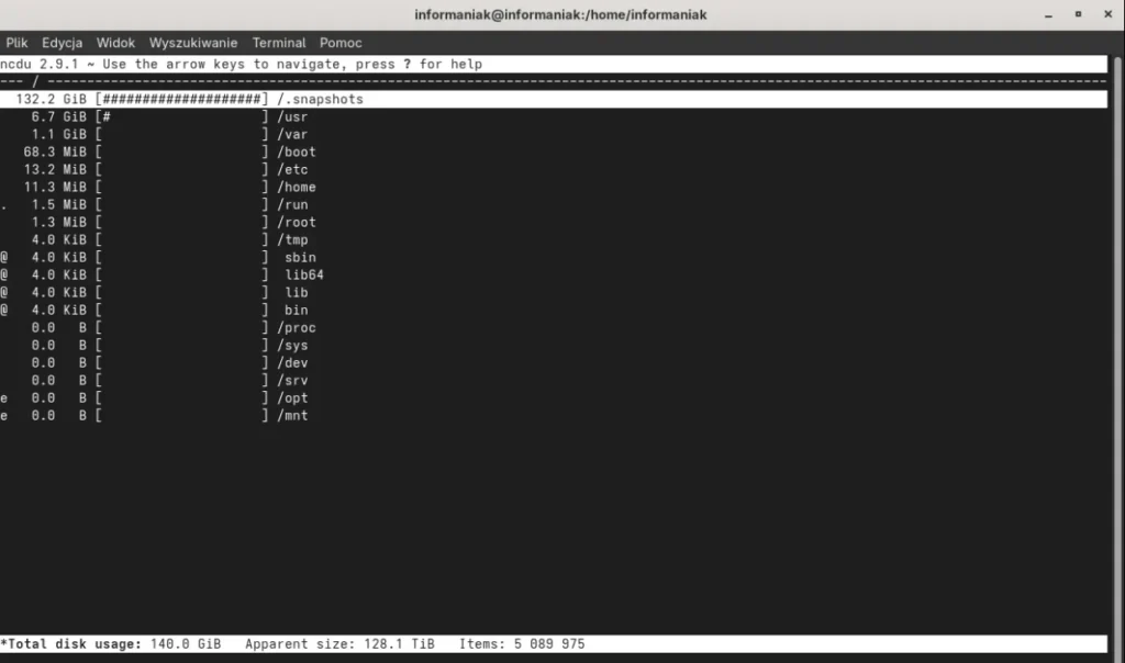 sudo ncdu [nazwa katalogu, np.: /home/informaniak]Po uruchomieniu program rozpocznie skanowanie wybranego katalogu