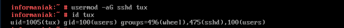 usermod -aG sshd tuxProsta weryfikacja czy komenda zakończyła swoje działanie pomyślnie: